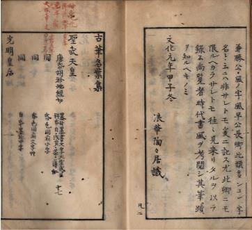 緑色地に小葵と唐花を織り出した緞子表紙(16・0×10・0センチ)左上に金砂子蒔き題簽を貼るが、書名記入なし。見返しに瑞雲の飾り枠を刻し「古筆名葉集 一冊/此書は手鑑押張并に古筆切ものゝ類/何の切といふことを此小冊を以て即坐にしら/しむ・・・青藜館蔵梓」と薄茶色にて刷る。巻頭に不関叟の序2丁、上田秋成(1734~1809)序1丁、凡例2丁があり、本文は32丁。次に付録の「増補一字名」11丁と文政11年(1828)青藜館主人の「古筆名葉集附言」2丁と出版広告、末尾に「文政七年 甲申五月/大阪書林 柏原清右衛門」以下の刊記。本文匡郭4周単辺(12・8×6・9センチ)1面8行。巻頭に朱の書入れあり。虫損若干。